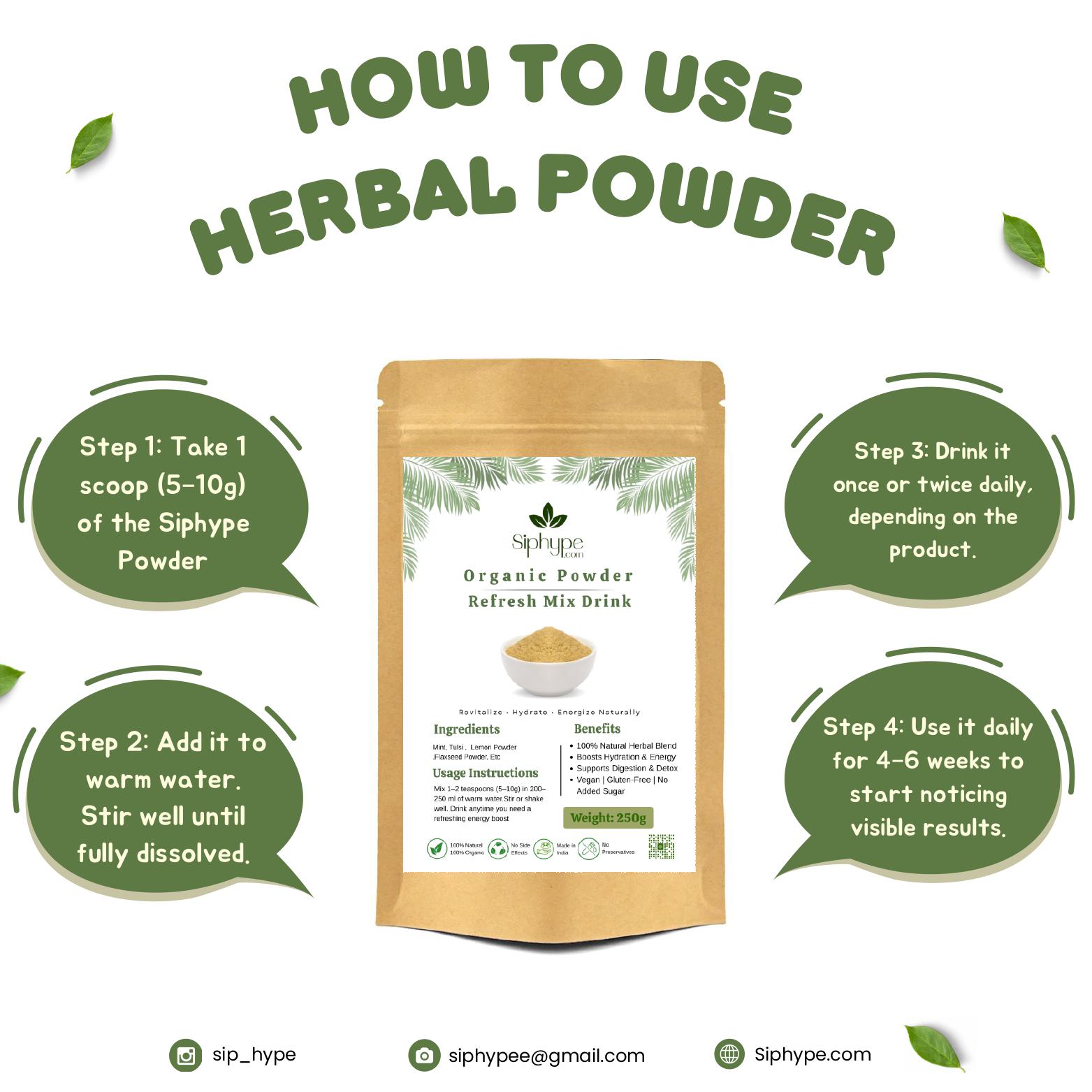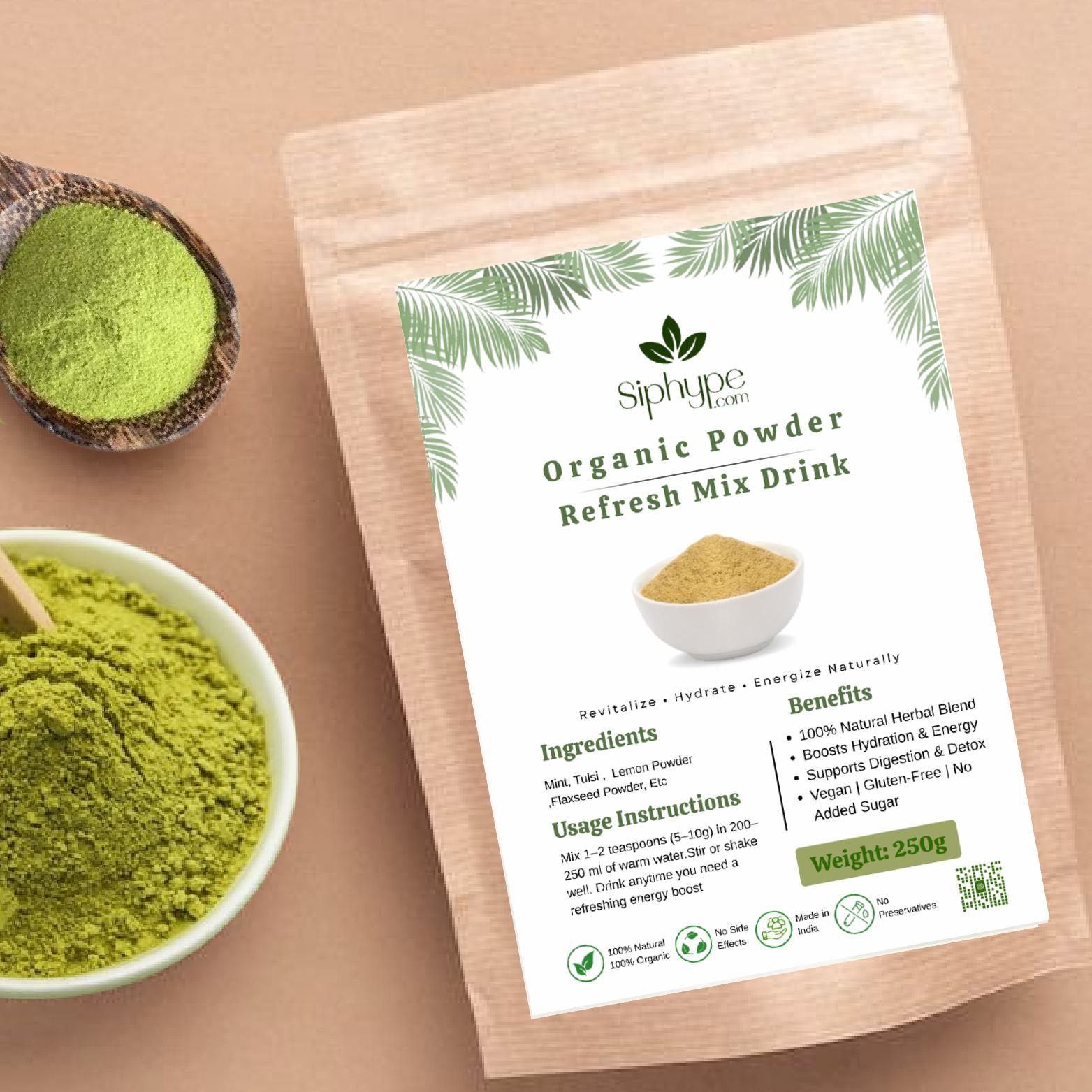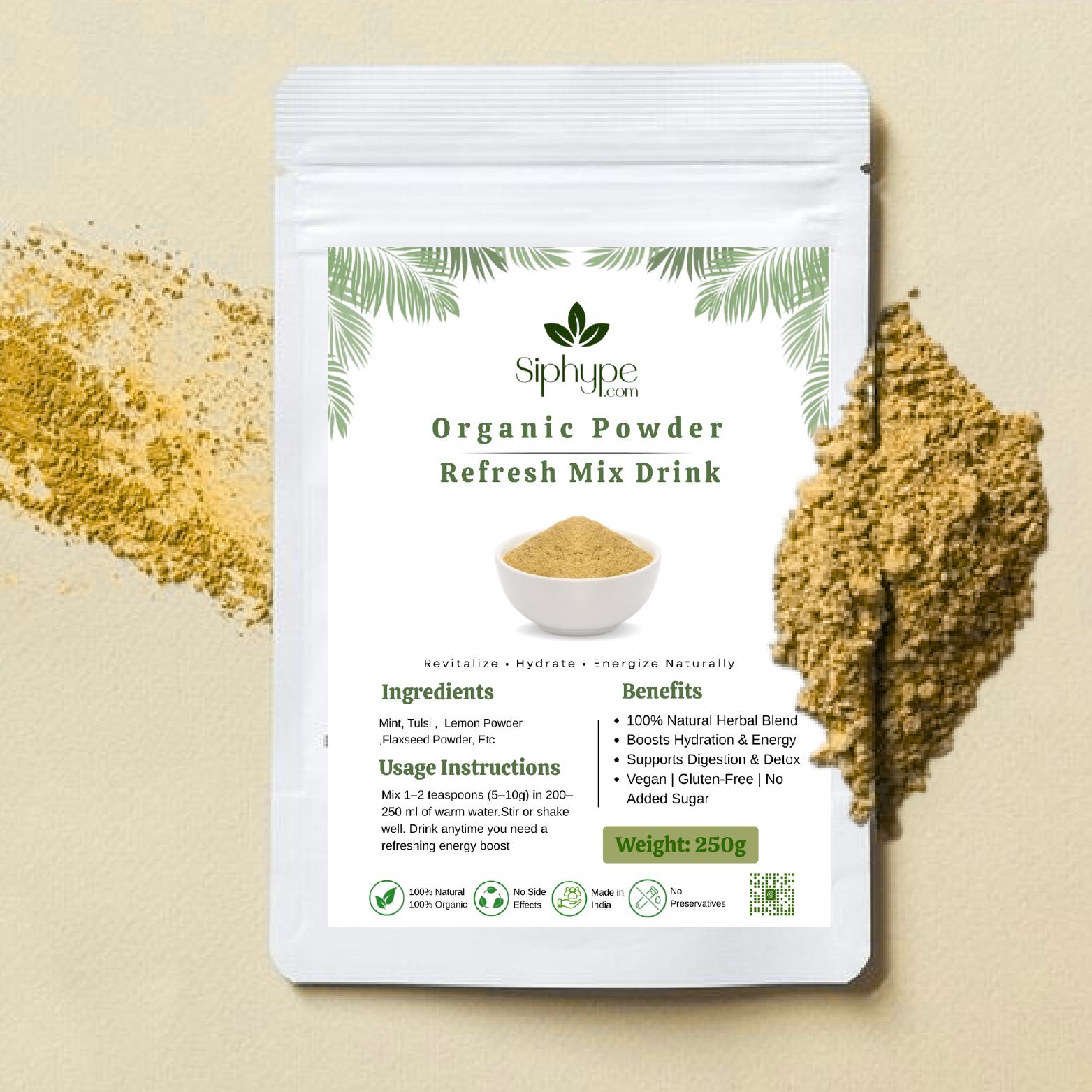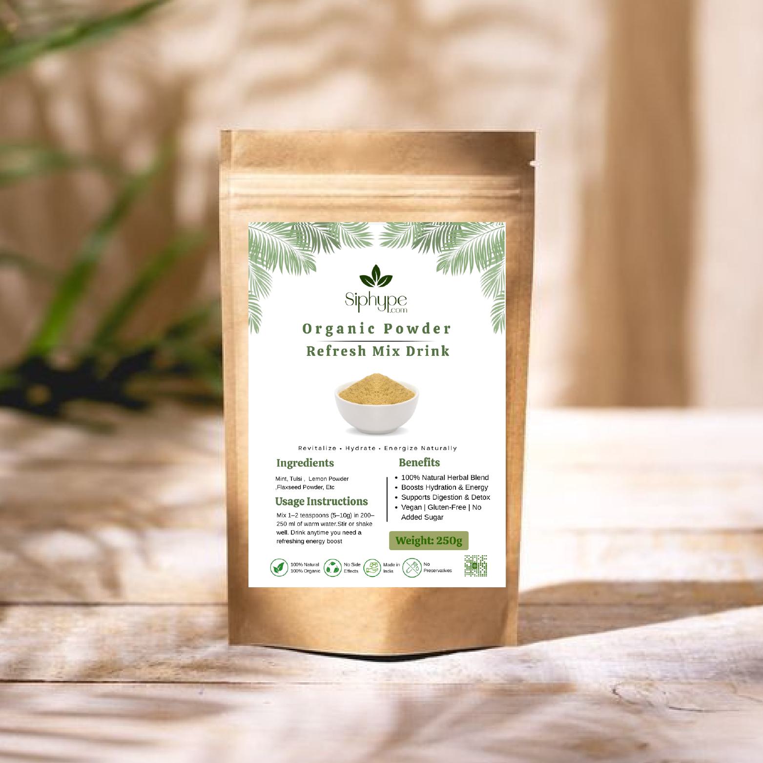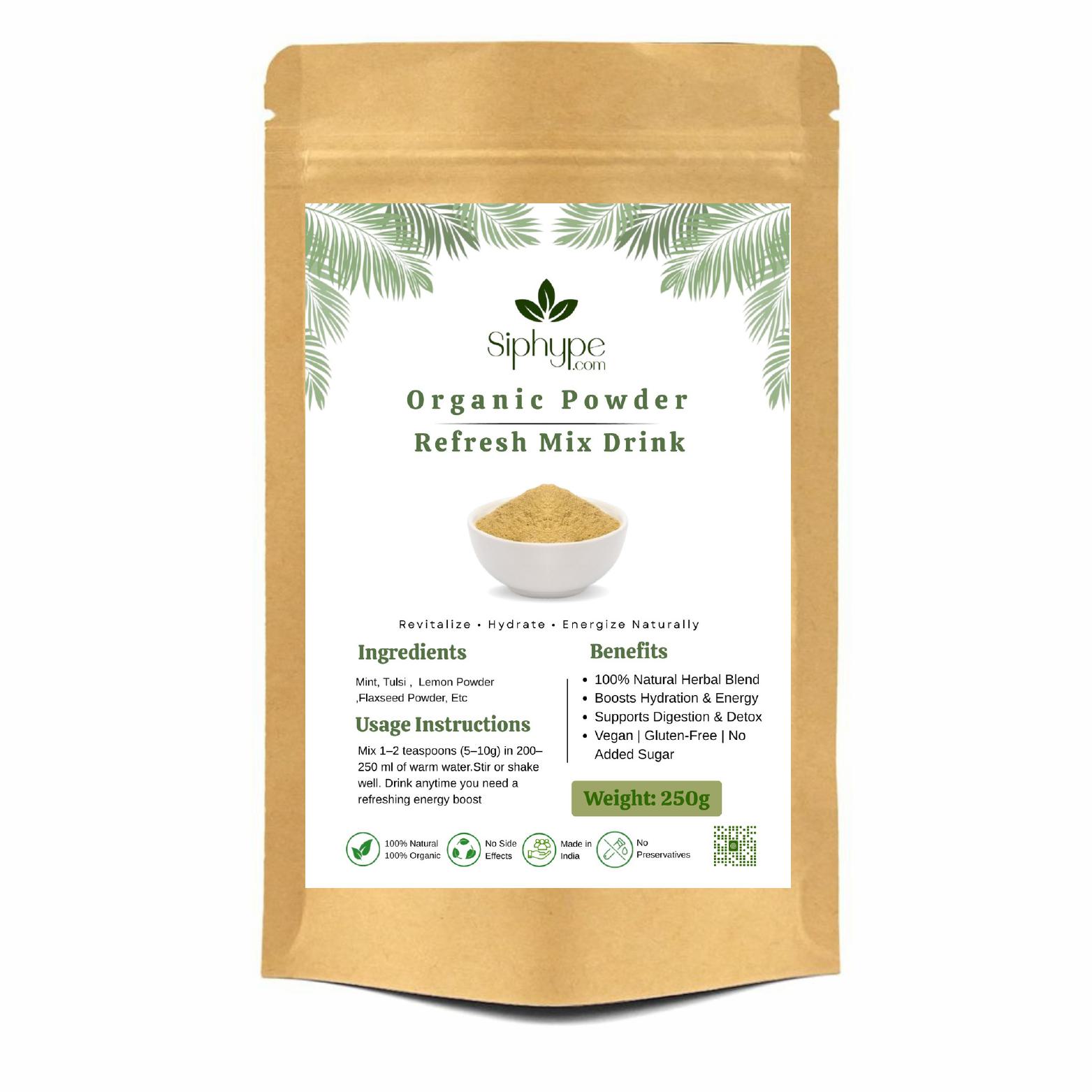 Siphype Refresh Mix is a revitalizing herbal powder crafted from natural ingredients that hydrate, refresh, and energize your body. This blend supports detoxification, improves digestion, and provides a natural boost for overall wellness and vitality.