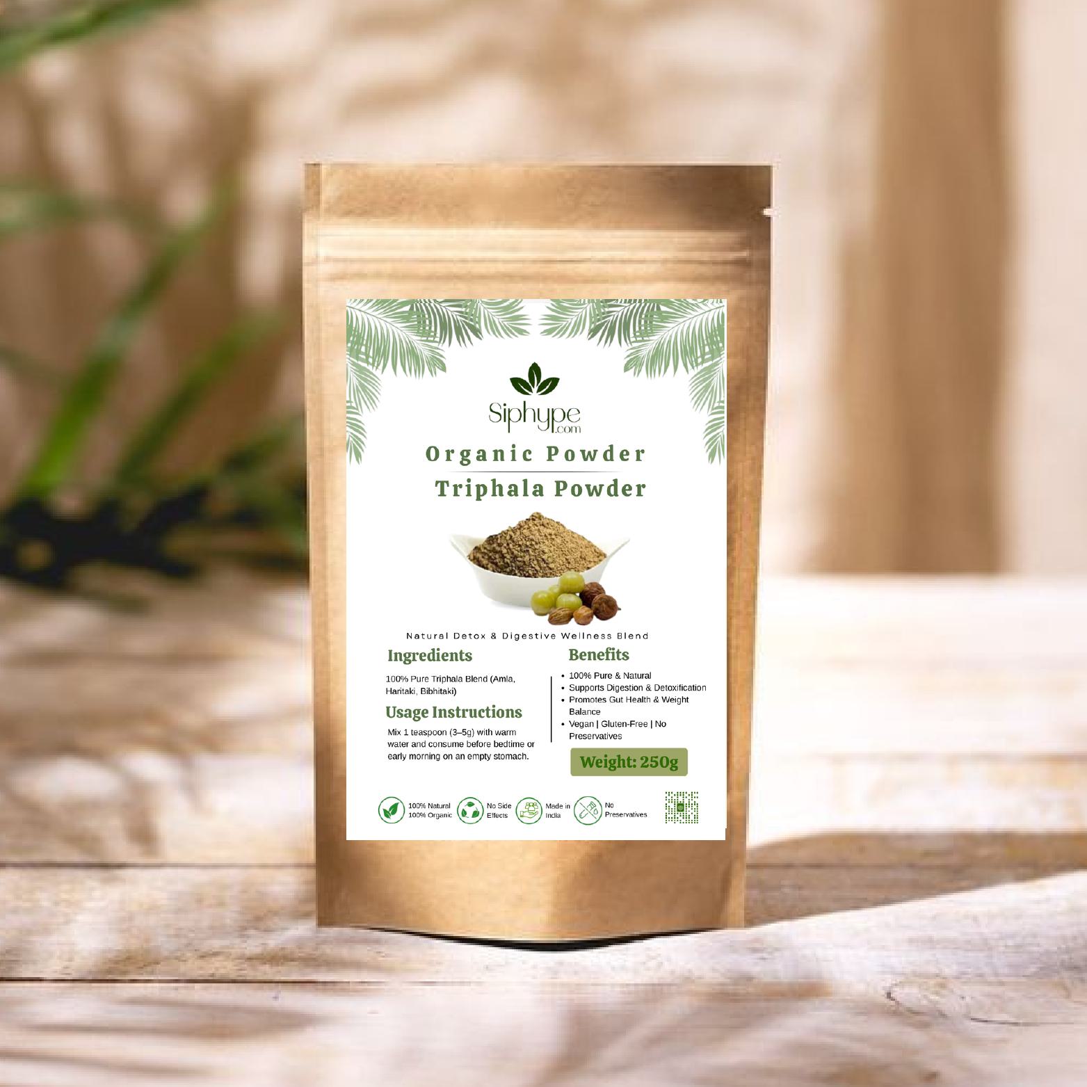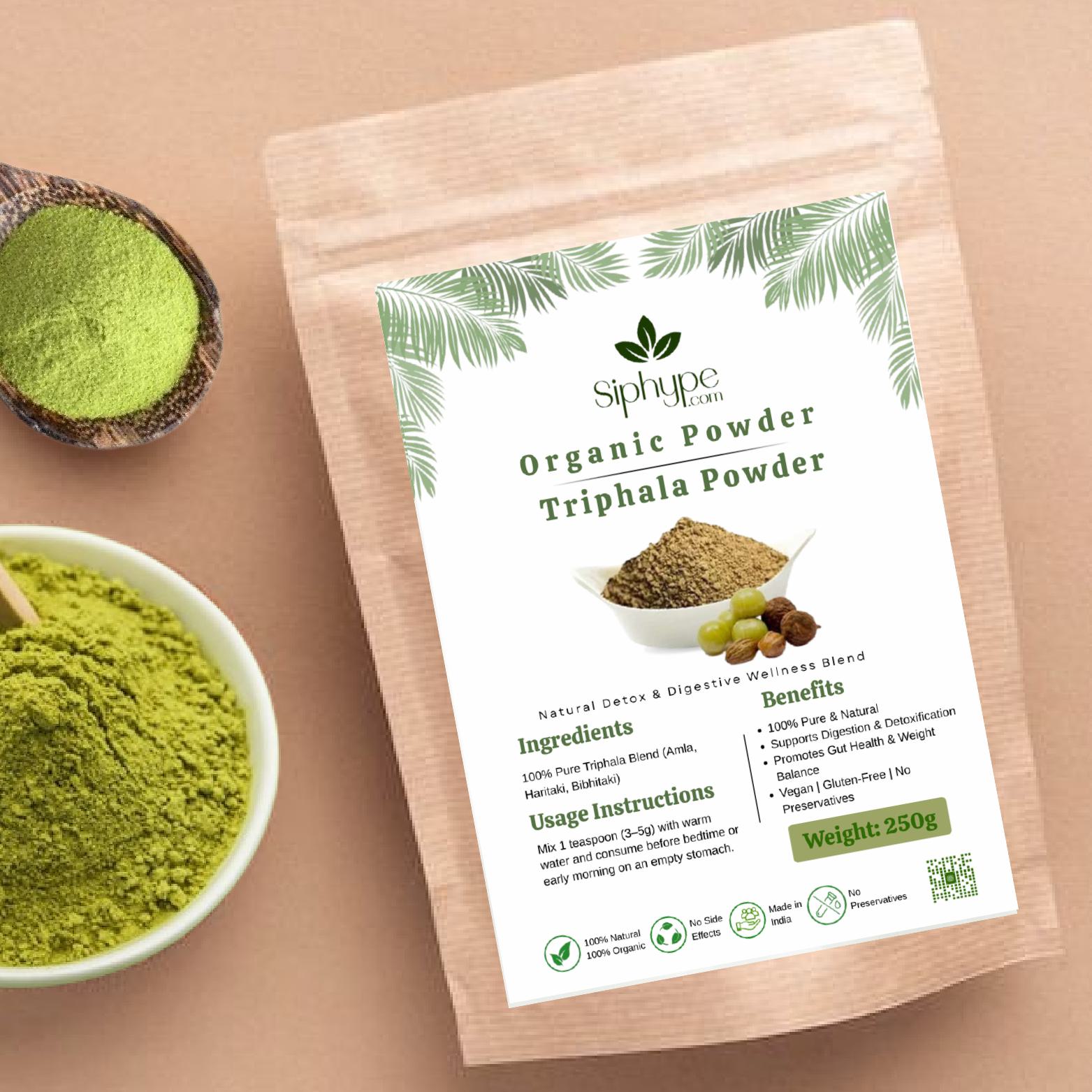 Siphype Triphala Powder is a powerful Ayurvedic detox blend made from three rejuvenating fruits — Amla, Haritaki, and Bibhitaki. Known as Ayurveda’s ultimate cleansing formula, Triphala gently detoxifies the digestive system, supports gut health, boosts immunity, and improves nutrient absorption.